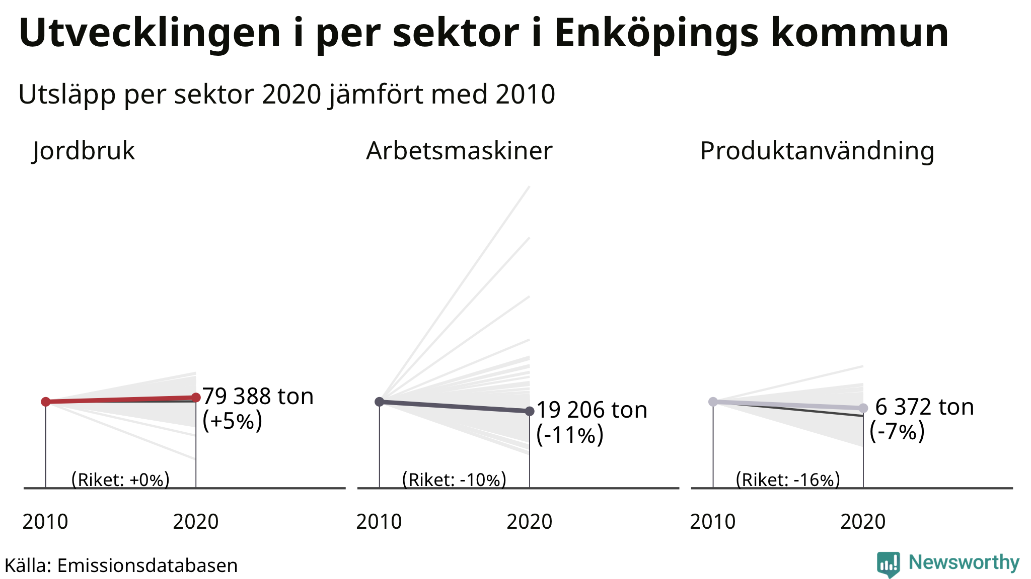 Efter transporter står jordbruket för störst territoriella utsläpp av växthustgaser i Enköping, 79 388 ton, eller 33 procent av utsläppen. Det är också en sektor där utsläppen legat relativt still i Sverige de senaste tio åren, medan de ökat något i Enköping.