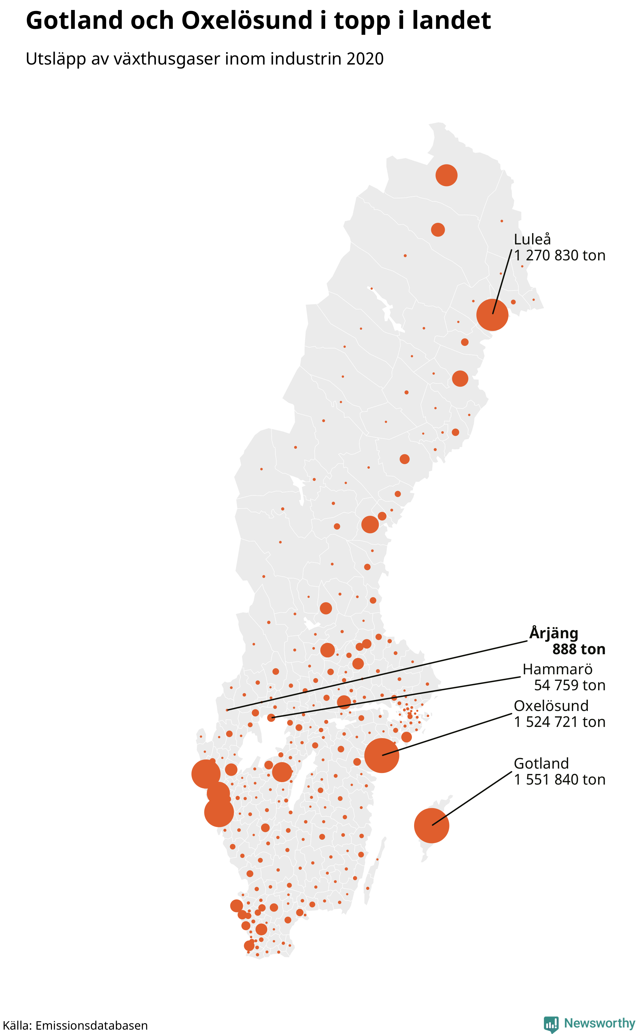 Precis som inrikes transporter står industrin för ungefär en tredjedel av Sveriges territoriella utsläpp. Men de utsläppen är betydligt mer ojämnt spridda över landet. 70 procent av utsläppen av växthusgaser från industri släpps ut i tio kommuner och i riket har utsläppen minskat med 28 procent sedan 2010. Industrin står för 888 ton i Årjängs kommun, vilket är en relativt liten del av utsläppen, 2 procent. Utsläppen har minskat med 70 procent jämfört med 2010. Det finns en viss osäkerhet i industrisiffrorna från kommunen eftersom knappt hälften av utsläppen är modellskattningar.Mest industriutsläpp i Värmlands län skedde i Hammarö kommun under 2020, som tillhör den tredjedel av kommuner i landet som har största industriutsläpp.