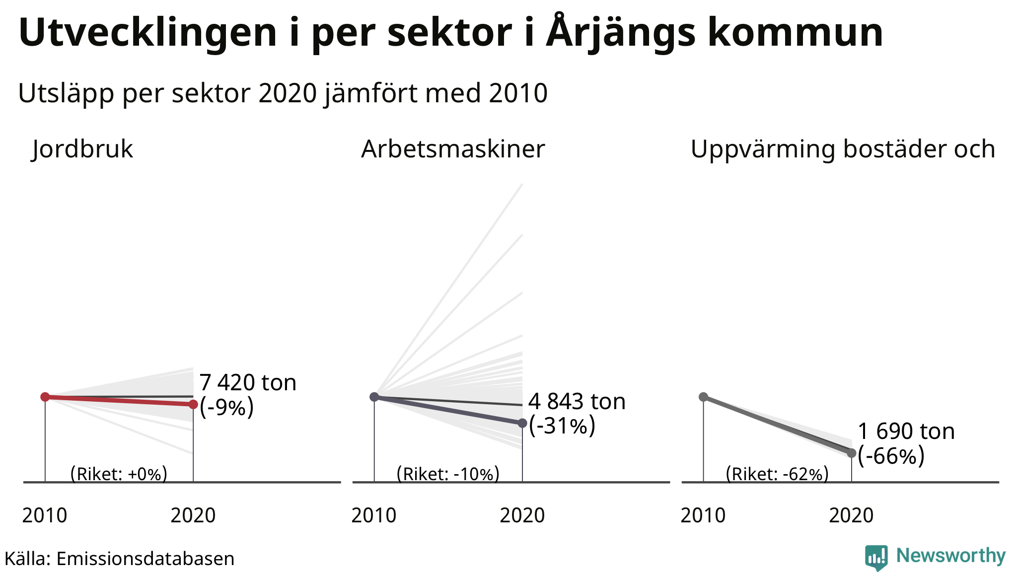 Sedan 1990 har utsläppen av växhusgaser minskat med 50 procent i Årjängs kommun. Störst minskning står uppvärming av bostäder och lokaler för – 30 599 ton 1990 jämfört med 1 690 ton 2020. Sektorn har minskat stort i hela landet i takt med att oljepannor bytts ut mot andra uppvärmningsformer.