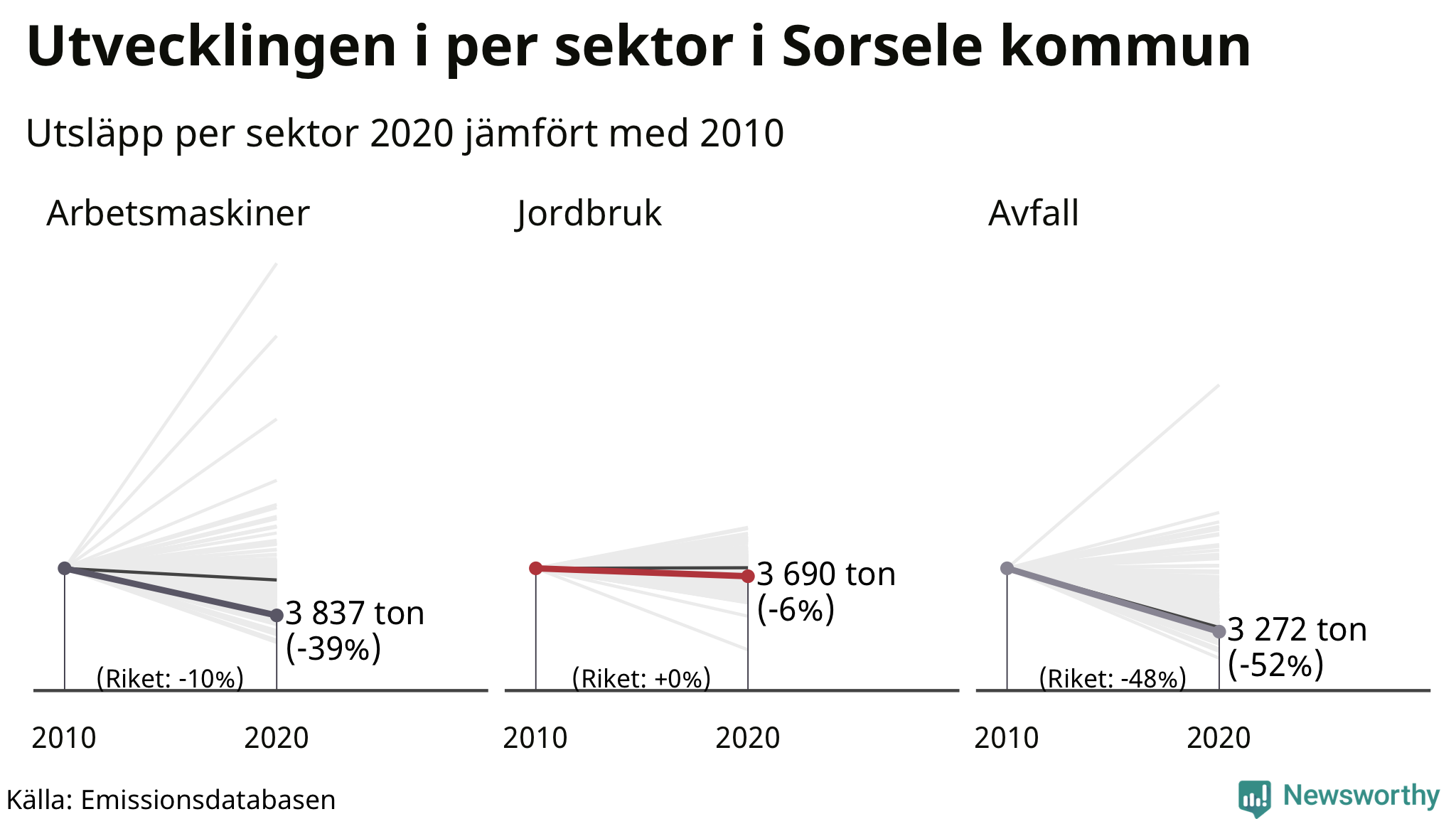 Arbetsmaskiner – hit räknas såväl industri- och byggsektorns maskiner som jordbruksredskap och fiskebåtar, skotrar och fyrhjulingar – stod för 3 837 ton eller 17 procent av utsläppen i Sorsele i 2020. Det är en minskning med 39 procent sedan 2010.