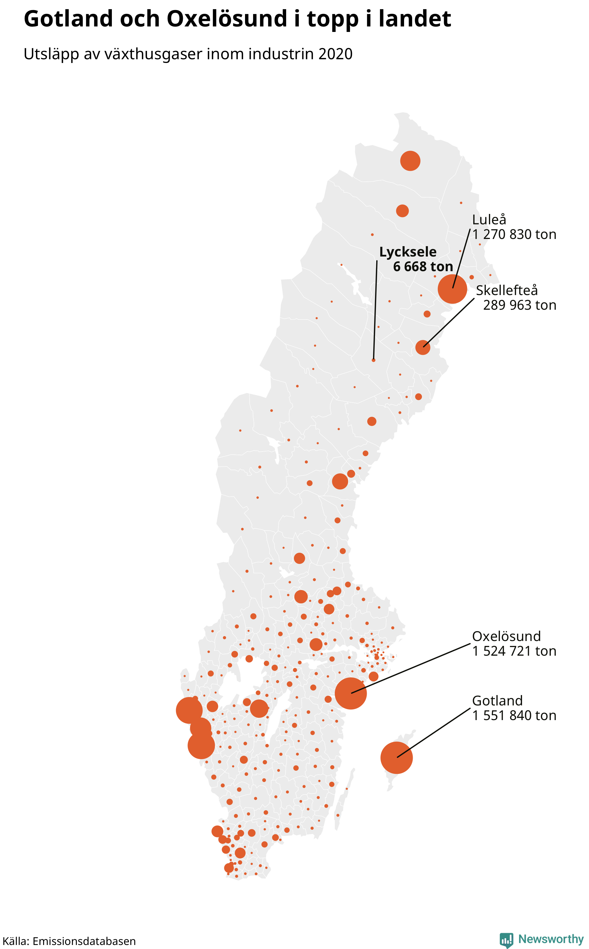 Precis som inrikes transporter står industrin för ungefär en tredjedel av Sveriges territoriella utsläpp. Men de utsläppen är betydligt mer ojämnt spridda över landet. 70 procent av utsläppen av växthusgaser från industri släpps ut i tio kommuner och i riket har utsläppen minskat med 28 procent sedan 2010. Lycksele tillhör inte kommunerna med störst utsläpp, enligt SMHI:s siffror stod industrin i kommunen för 6 668 ton, eller 11 procent av utsläppen, 2020. Utsläppen har ökat med 40 procent jämfört med 2010.Mest industriutsläpp i Västerbottens län skedde i Skellefteå kommun under 2020, som tillhörde de kommuner i landet som har störst industriutsläpp.