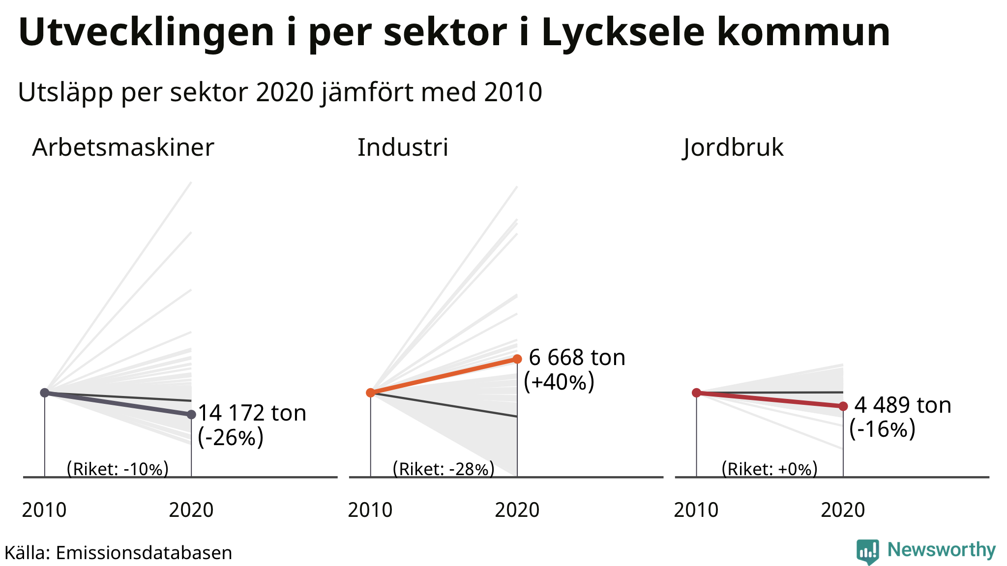 Arbetsmaskiner – hit räknas såväl industri- och byggsektorns maskiner som jordbruksredskap och fiskebåtar, skotrar och fyrhjulingar – stod för 14 172 ton eller 24 procent av utsläppen i Lycksele i 2020. Det är en minskning med 26 procent sedan 2010.