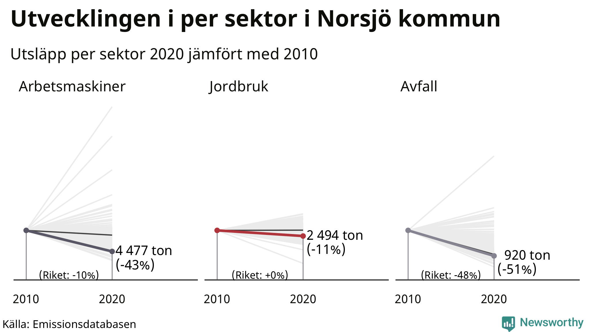 Arbetsmaskiner – hit räknas såväl industri- och byggsektorns maskiner som jordbruksredskap och fiskebåtar, skotrar och fyrhjulingar – stod för 4 477 ton eller 23 procent av utsläppen i Norsjö i 2020. Det är en minskning med 43 procent sedan 2010.
