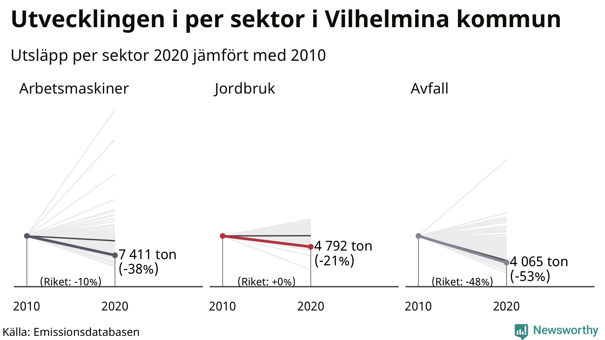 Arbetsmaskiner – hit räknas såväl industri- och byggsektorns maskiner som jordbruksredskap och fiskebåtar, skotrar och fyrhjulingar – stod för 7 411 ton eller 20 procent av utsläppen i Vilhelmina i 2020. Det är en minskning med 38 procent sedan 2010.