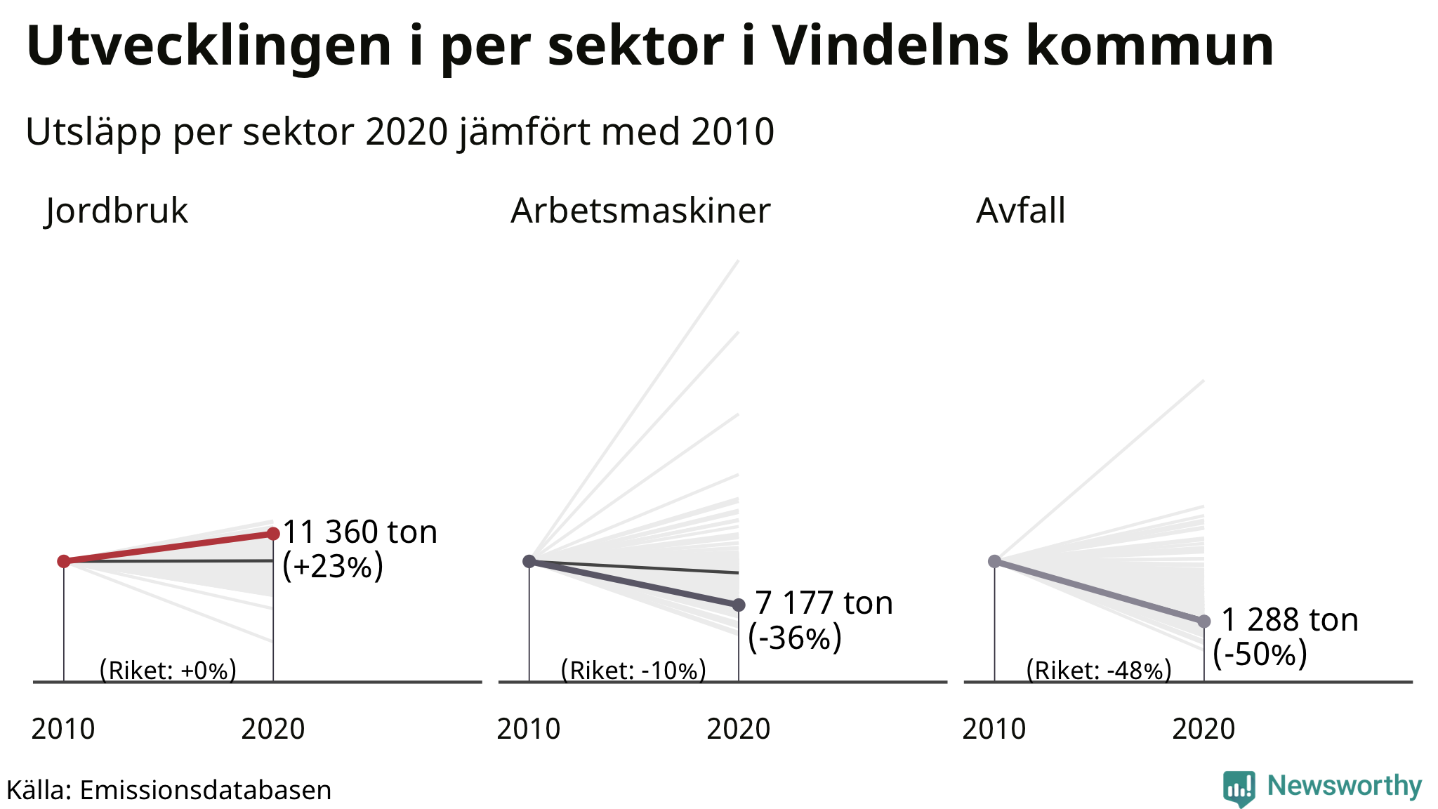 Utsläppen av växthusgaser ökade – till skillnad från i riket i stort – i Vindelns kommun 2020. Det visar SMHI:s nya, regionala utsläppssiffror. Totalt släpptes 39 758 ton koldioxidekvivalenter ut i kommunen – vilket är ungefär lika mycket som året innan. Störst ökning, plus 2 685 ton, stod jordbrukssektorn för.