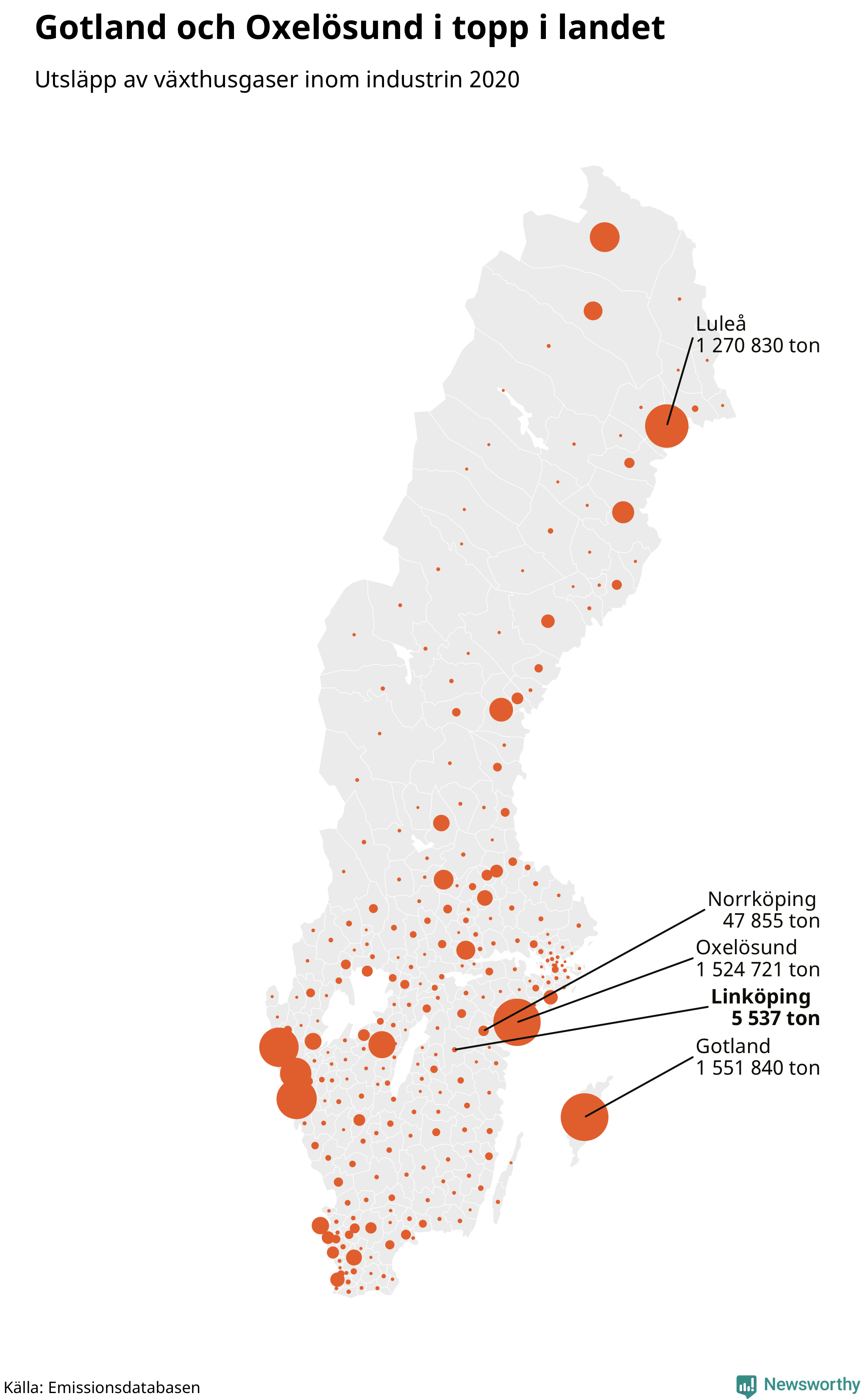 Precis som inrikes transporter står industrin för ungefär en tredjedel av Sveriges territoriella utsläpp. Men de utsläppen är betydligt mer ojämnt spridda över landet. 70 procent av utsläppen av växthusgaser från industri släpps ut i tio kommuner och i riket har utsläppen minskat med 28 procent sedan 2010. Industrin står för en väldigt liten del av utsläppen i Linköpings kommun, 2020 släpptes 5 537 ton koldioxidekvivalenter ut i kommunen.Utsläppen har minskat med 87 procent jämfört med 2010.Mest industriutsläpp i Östergötlands län skedde i Norrköpings kommun under 2020, som tillhör den tredjedel av kommuner i landet som har största industriutsläpp.