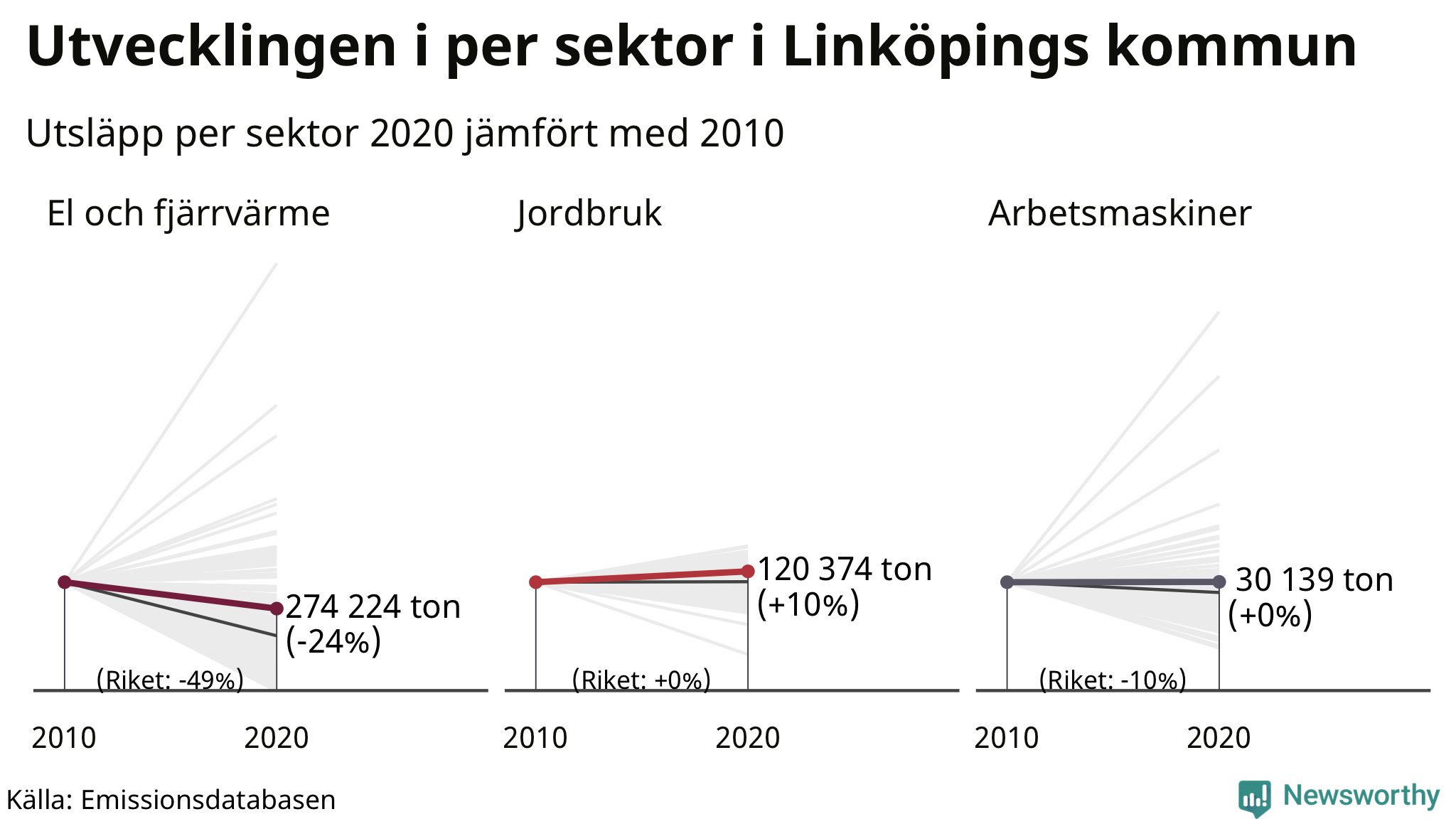 Utsläpp av växthusgaser från el och fjärrvärme stod för 41 procent (274 224 ton) av de totala territoriella utsläppen i Linköpings kommun 2020. Därmed är kommunen en av sju där sektorn står för de största utsläppen av växthusgaser. Jämfört med 2010 – som visserligen var en kall vinter – har utsläppen inom sektorn minskat med 24 procent.