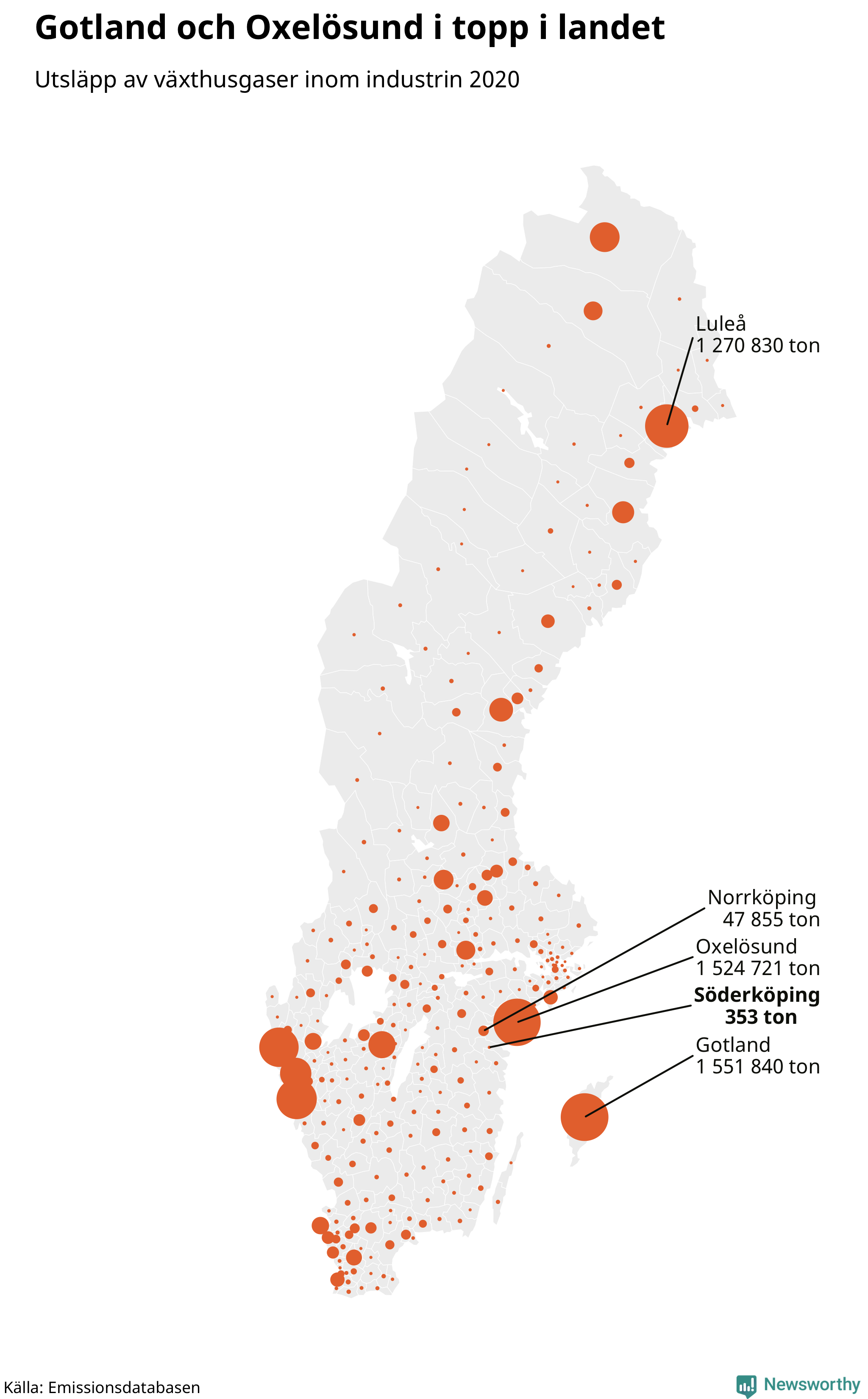 Precis som inrikes transporter står industrin för ungefär en tredjedel av Sveriges territoriella utsläpp. Men de utsläppen är betydligt mer ojämnt spridda över landet. 70 procent av utsläppen av växthusgaser från industri släpps ut i tio kommuner och i riket har utsläppen minskat med 28 procent sedan 2010. Industrin står för en väldigt liten del av utsläppen i Söderköpings kommun, 2020 släpptes 353 ton koldioxidekvivalenter ut i kommunen.Utsläppen har minskat med 63 procent jämfört med 2010. Siffrorna över industriutsläpp i Söderköping bygger till stor del på uppskattningar och är ganska osäkra.Mest industriutsläpp i Östergötlands län skedde i Norrköpings kommun under 2020, som tillhör den tredjedel av kommuner i landet som har största industriutsläpp.