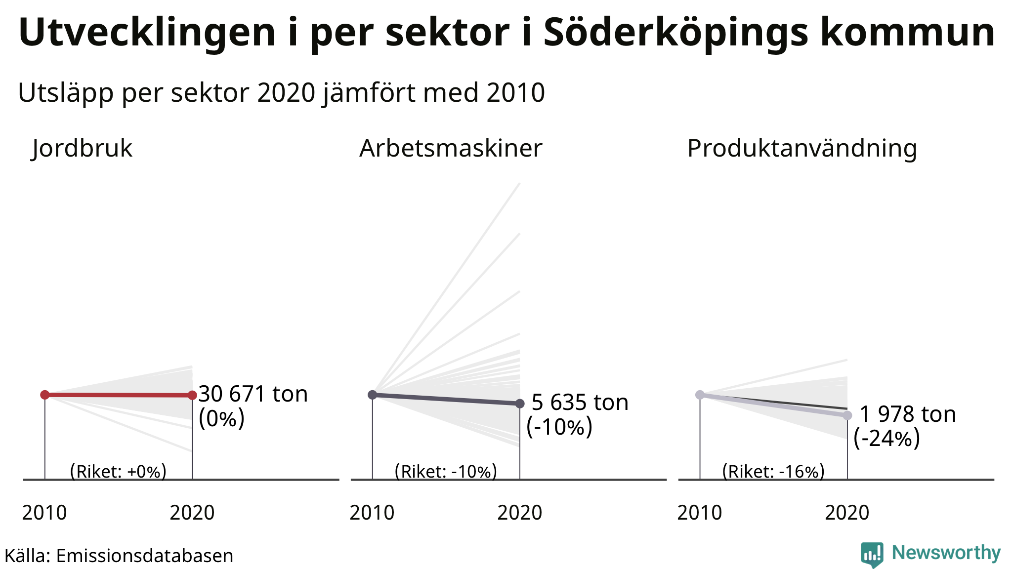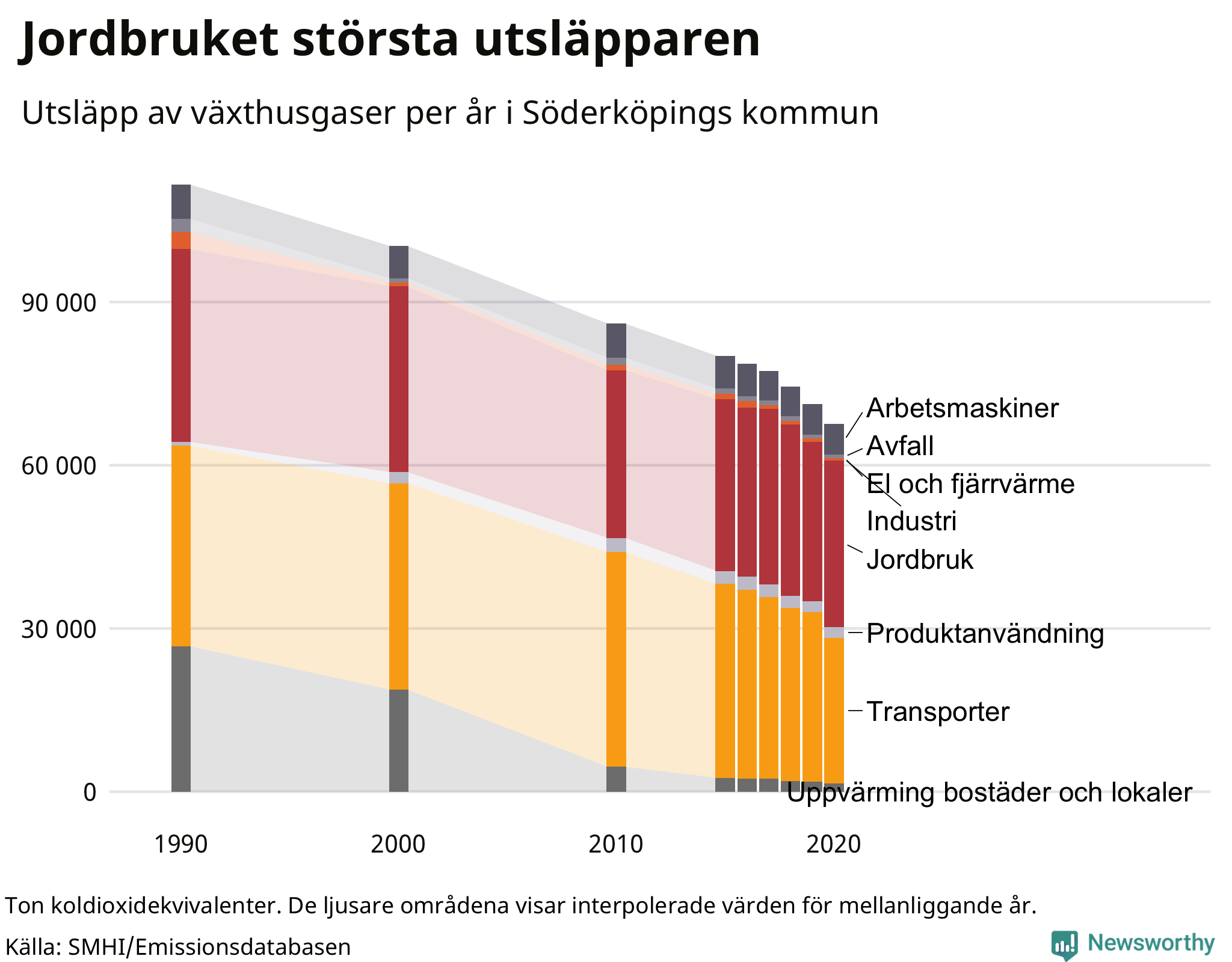 Räknar man alla växthusgaser som släpptes ut i Söderköping 2020 står jordbrukssektorn för 30 671 ton, vilket motsvarar 45 procent av de territoriella utsläppen i kommunen. Det är en sektor där utsläppen legat relativt still under de senaste tio åren.