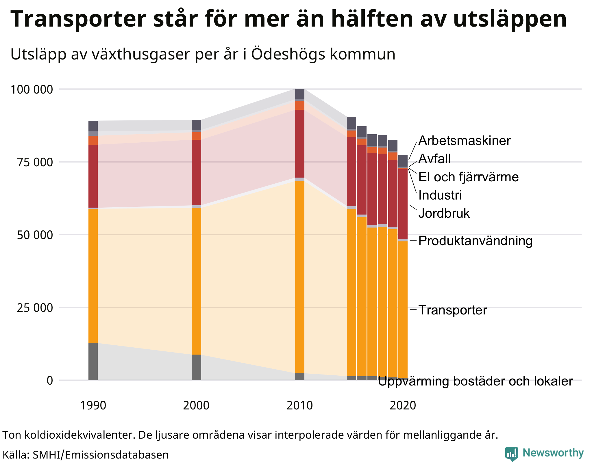 Utsläppen av växthusgaser minskade – precis som i riket i stort – i Ödeshögs kommun 2020. Det visar SMHI:s nya, regionala utsläppssiffror. Totalt släpptes 77 259 ton koldioxidekvivalenter ut i kommunen – en minskning med 6 procent jämfört med året innan. Störst var minskningen inom transportsektorn, som fortfarande är den största utsläppssektorn i kommunen – trots en minskning på 4 015 ton.