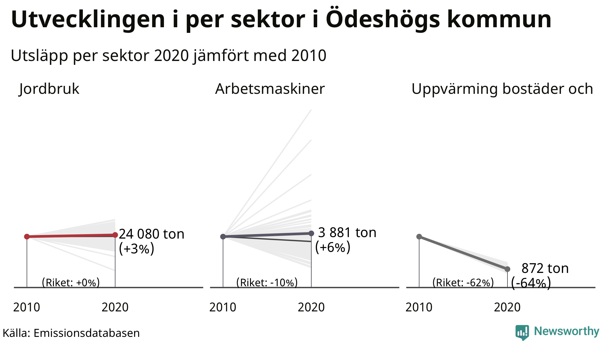 Sedan 1990 har utsläppen av växhusgaser minskat med 13 procent i Ödeshögs kommun. Störst minskning står uppvärming av bostäder och lokaler för – 12 794 ton 1990 jämfört med 872 ton 2020. Sektorn har minskat stort i hela landet i takt med att oljepannor bytts ut mot andra uppvärmningsformer.