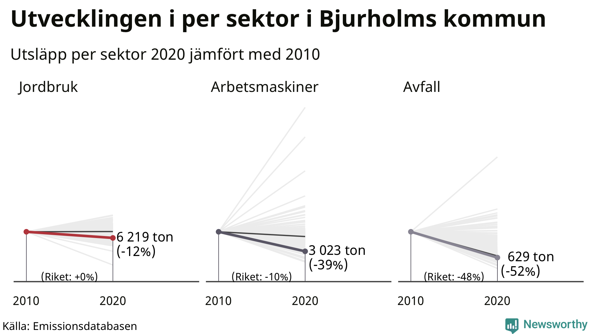 Utsläppen av växthusgaser minskade – precis som i riket i stort – i Bjurholms kommun 2020. Det visar SMHI:s nya, regionala utsläppssiffror. Totalt släpptes 18 101 ton koldioxidekvivalenter ut i kommunen – en minskning med 9 procent jämfört med året innan. Störst var minskningen inom transportsektorn, som fortfarande är den största utsläppssektorn i kommunen – trots en minskning på 1 167 ton.