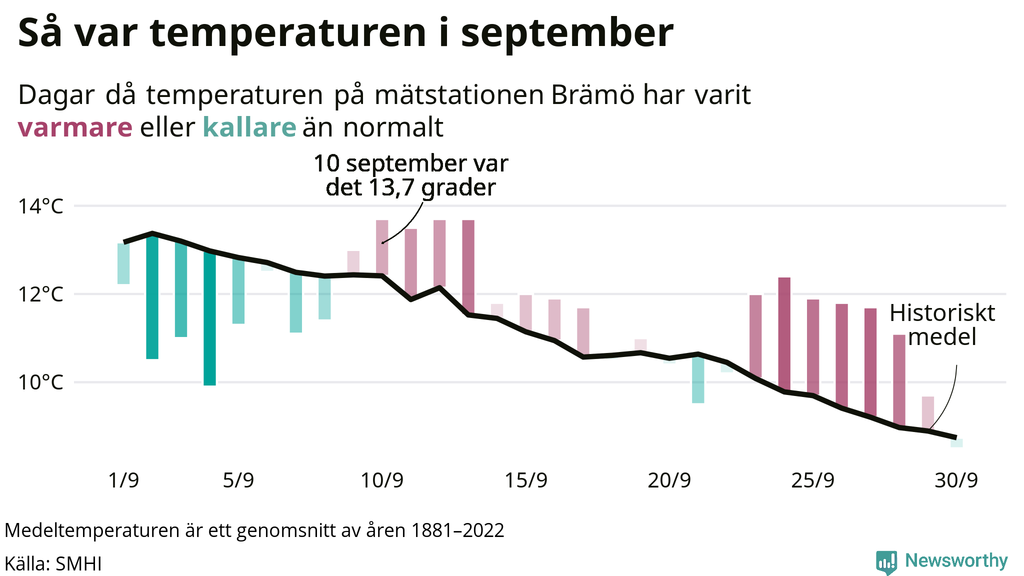 Under 17 av 30 dagar låg medeltemperaturen över det normala på Brämön. Sex av de här dagarna var temperaturen betydligt1 högre än vanligt.