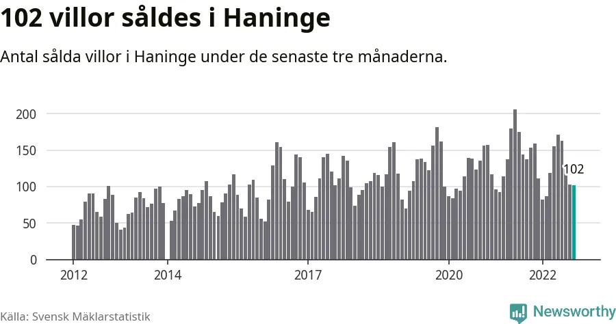 Sammanlagt såldes 102 villor i Haninge kommun mellan juli och september till ett genomsnittligt pris på 4,9 miljoner kronor. I fjol gjordes 137 affärer vid den här tiden på året.