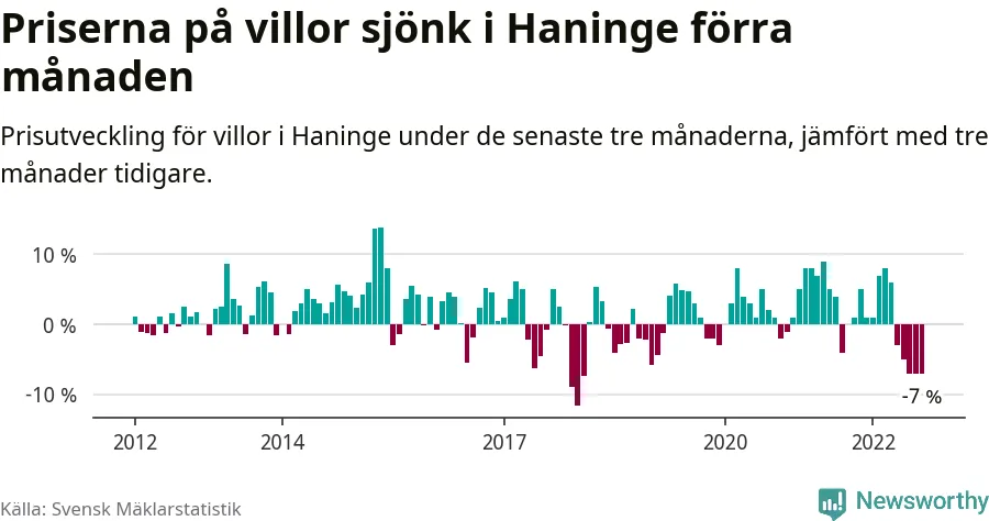 Villapriserna sjönk mellan juli och september med 7 procent i Haninge kommun. Det är en betydande nedgång jämfört med det gångna året då priserna i snitt stått stilla.