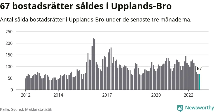 Mellan juli och september såldes 67 bostadsrätter i Upplands-Bro kommun. Det är färre än någon tremånadersperiod sedan 2019.