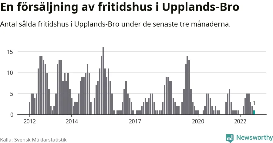 Mellan juli och september gjordes sammanlagt en affär med fritidshus i Upplands-Bro kommun. Det är lika många affärer som vid motsvarande tid i fjol.