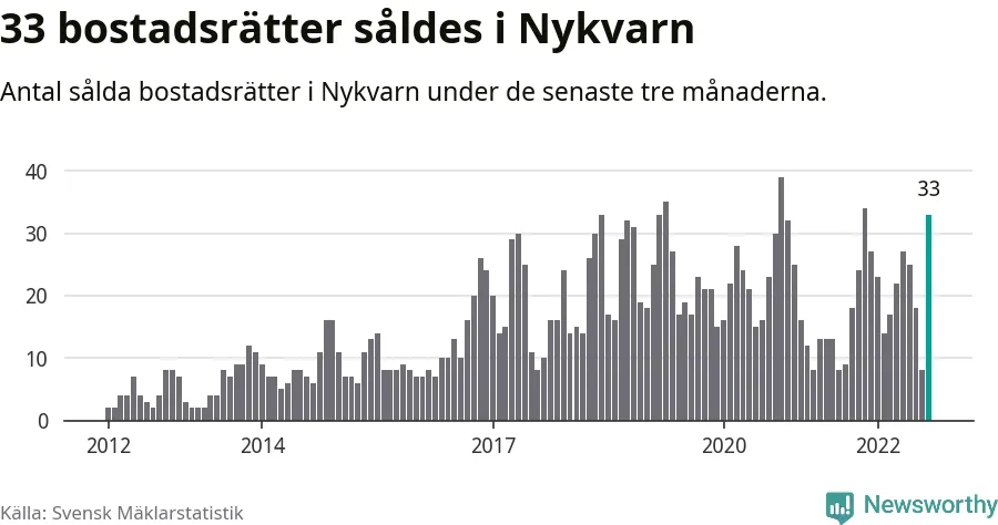 Mellan juli och september gjordes sammanlagt 33 affärer med bostadsrätter i Nykvarns kommun. Det kan jämföras med 18 vid motsvarande tid i fjol.