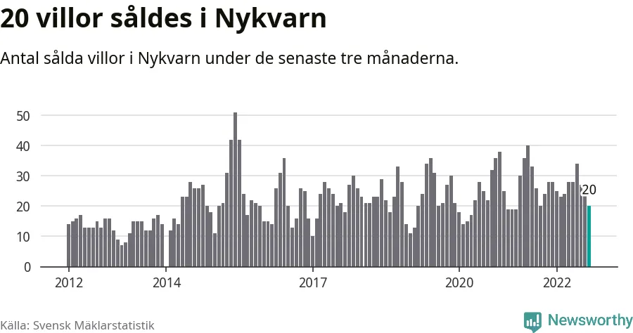 Mellan juli och september gjordes sammanlagt 20 affärer med villor i Nykvarns kommun. Det är lika många affärer som vid motsvarande tid i fjol.