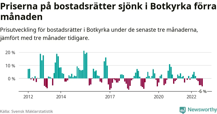 Statistiken visar även på en kännbar prisnedgång i Botkyrka kommun. Medelpriset på försäljningarna av bostadsrätter i kommunen var 6 procent lägre än för tre månader sedan. Även i hela Stockholms län sjunker priserna på bostadsrätter. I hela länet noterades en prisnedgång på 8 procent.