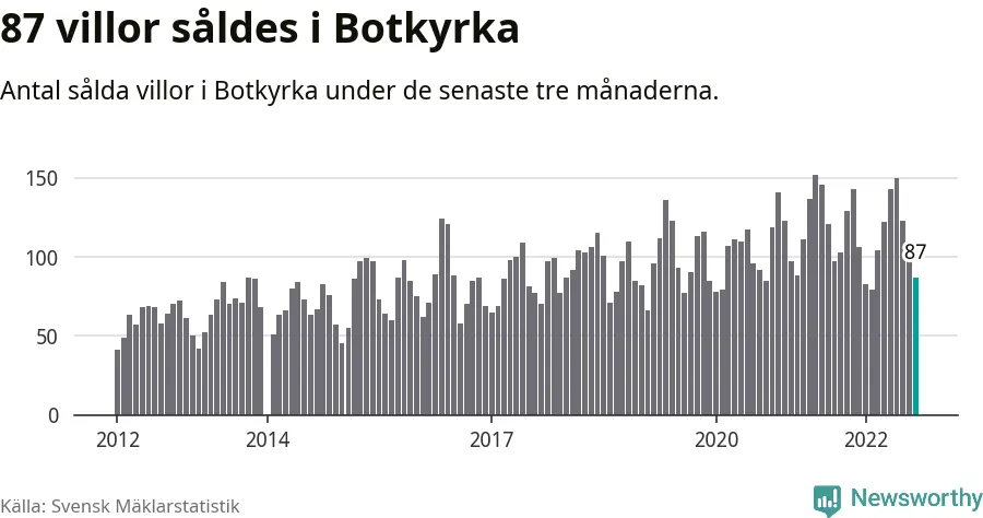 Sammanlagt såldes 87 villor i Botkyrka kommun mellan juli och september till ett genomsnittligt pris på 4,8 miljoner kronor. I fjol gjordes 103 affärer vid den här tiden på året.