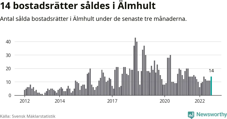 Mellan juli och september gjordes sammanlagt 14 affärer med bostadsrätter i Älmhults kommun. Det kan jämföras med 15 vid motsvarande tid i fjol.