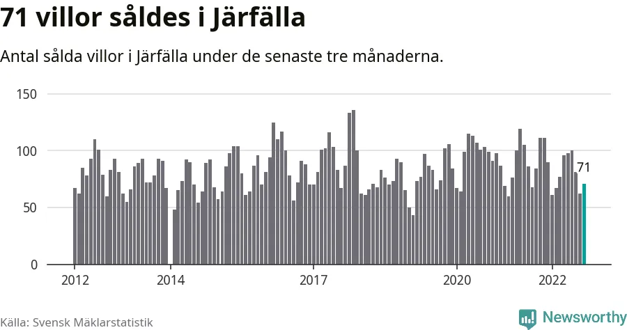 Sammanlagt såldes 71 villor i Järfälla kommun mellan juli och september till ett genomsnittligt pris på 6,1 miljoner kronor. I fjol gjordes 84 affärer vid den här tiden på året.