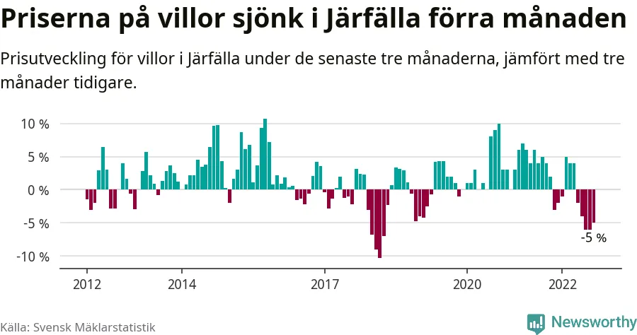 Villapriserna har gått ner i Järfälla kommun. Medelpriset på försäljningarna under de senaste tre månaderna visar på en nedgång med 5 procent.