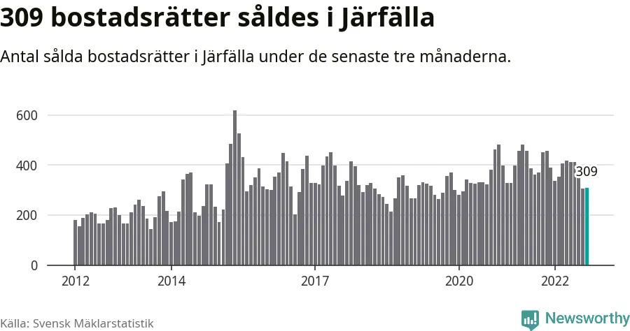 Sammanlagt såldes 309 bostadsrätter i Järfälla kommun mellan juli och september till ett genomsnittligt pris på 2,5 miljoner kronor. I fjol gjordes 370 affärer vid den här tiden på året.