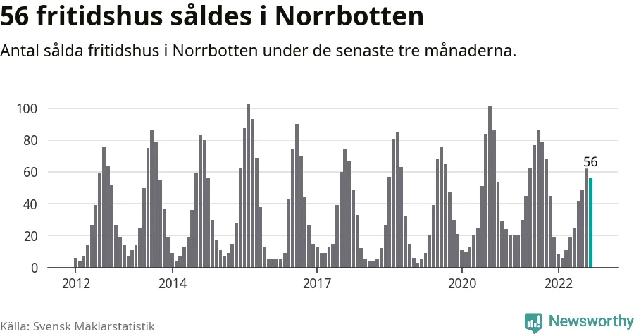 Mellan juli och september såldes 56 fritidshus i Norrbottens län. Det är relativt få sett till aktiviteten på bostadsmarknaden i länet under de senaste tolv månaderna, samt det historiska snittet för den här tiden på året.