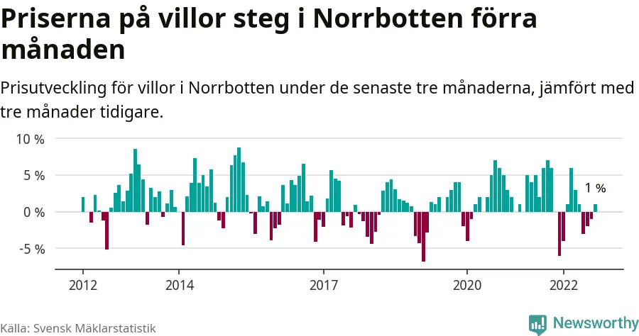 Villapriserna har gått upp i Norrbottens län. Medelpriset på försäljningarna under de senaste tre månaderna visar på en uppgång med 1 procent.