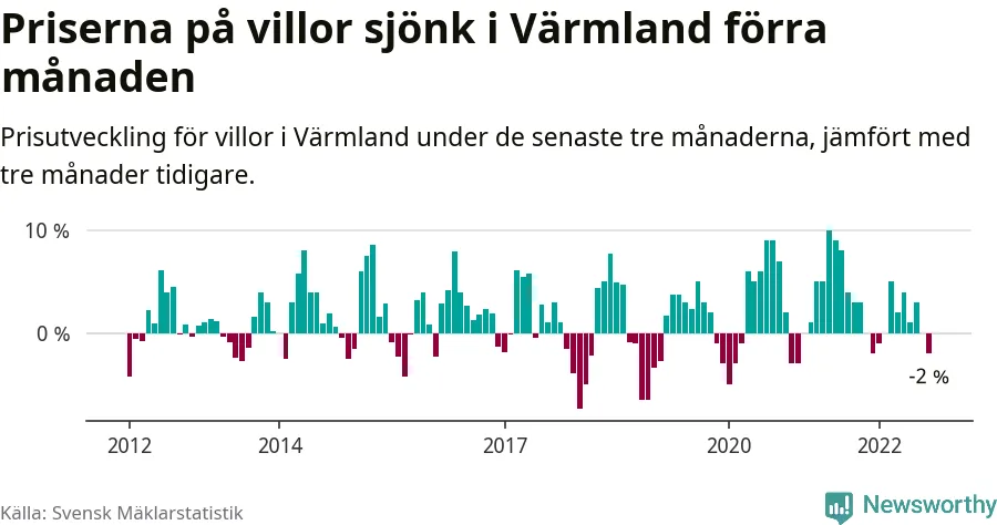 Villapriserna har gått ner i Värmlands län. Medelpriset på försäljningarna under de senaste tre månaderna visar på en nedgång med 2 procent.