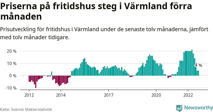 Priserna på fritidshus steg mellan oktober 2021 och september med 4 procent i Värmlands län. Det är en svagare ökning än under det gångna året då priserna i snitt ökat med 16 procent.