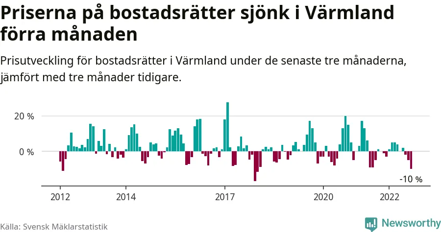 Priserna på bostadsrätter sjönk med 10 procent i Värmlands län under de senaste tre månaderna. Det är den svagaste prisutvecklingen sedan 2018.