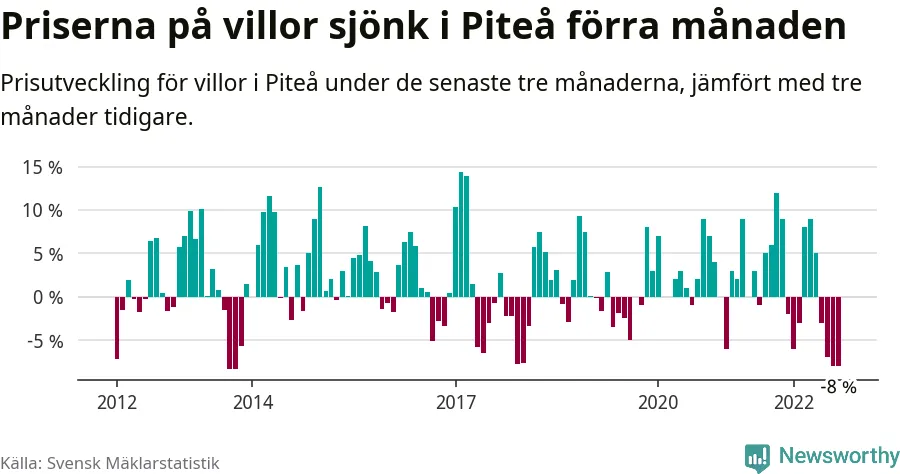Villapriserna sjönk mellan juli och september med 8 procent i Piteå kommun. Det är en betydande nedgång jämfört med det gångna året då priserna i snitt stått stilla.