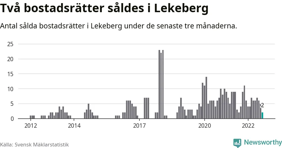 Mellan juli och september gjordes sammanlagt två affärer med bostadsrätter i Lekebergs kommun. Det kan jämföras med fyra vid motsvarande tid i fjol.