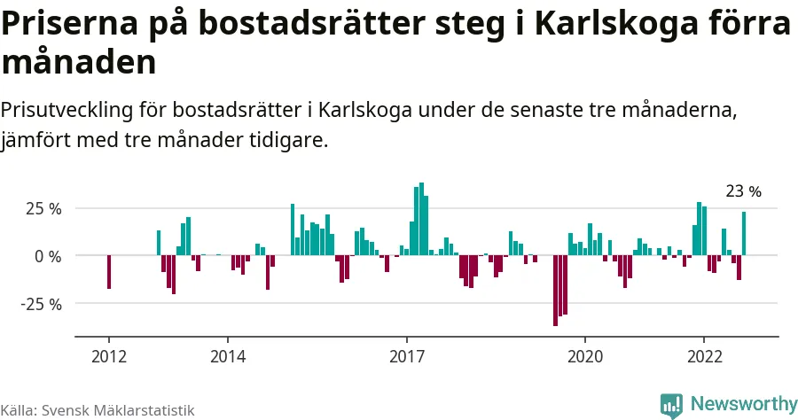 Statistiken visar även på en stor prisuppgång i Karlskoga kommun. Medelpriset på försäljningarna av bostadsrätter i kommunen var 23 procent högre än för tre månader sedan. I hela Örebro däremot sjunker priserna på bostadsrätter. I hela länet noterades en prisnedgång på 5 procent.