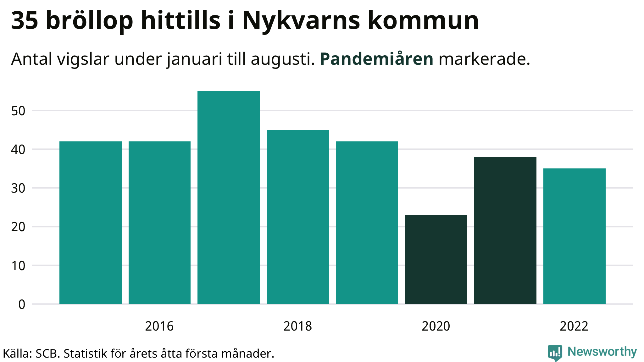 Till och med augusti i år har 35 giftermål registrerats i Nykvarns kommun. Det är ungefär på samma nivå som under pandemirestriktionerna, motsvarande siffra för 2020 och 2021 var 23 respektive 38 vigslar.
