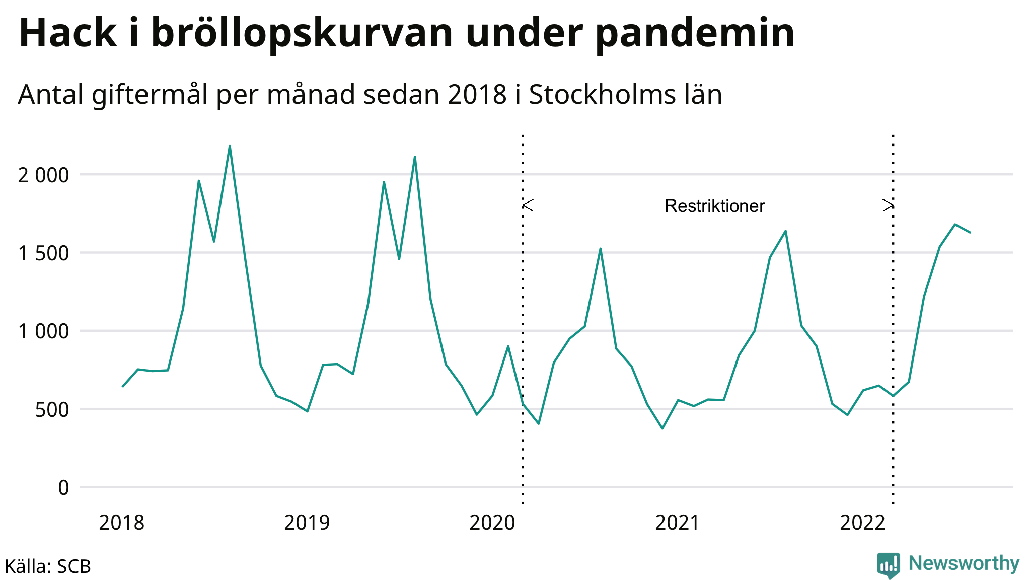 Stockholms län som helhet har bröllopskurvan återhämtat sig något – dock inte till samma nivå som innan pandemin. Hittills i år har 8 587 äktenskap ingåtts, jämfört med 6 929 i snitt under pandemin och runt 10 000 mellan 2015 och 2019. I fem av 26 kommuner är antalet vigslar i nivå med eller högre än åren innan pandemin.