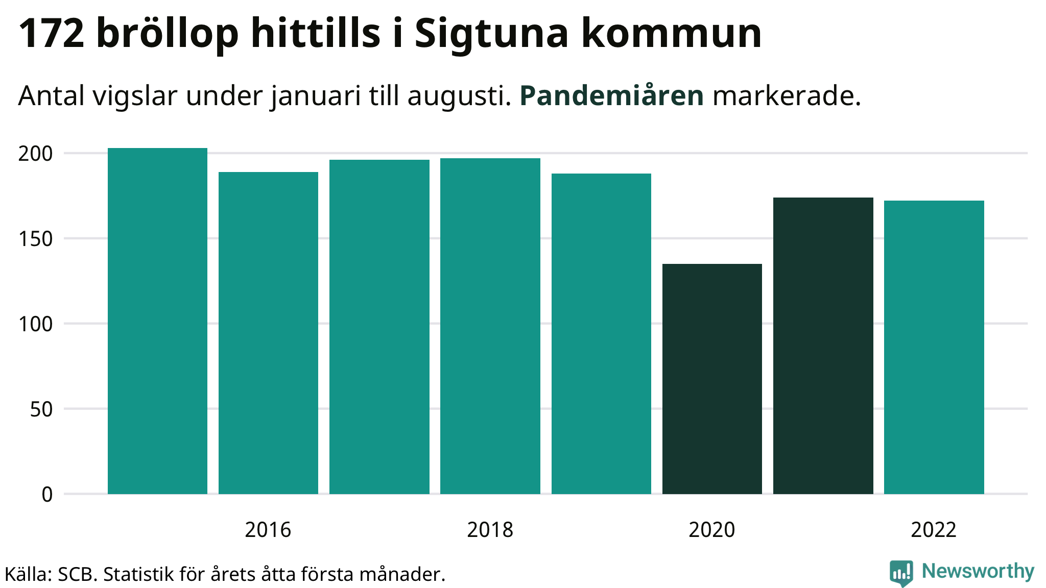 Till och med augusti i år har 172 giftermål registrerats i Sigtuna kommun. Det är ungefär på samma nivå som under pandemirestriktionerna, motsvarande siffra för 2020 och 2021 var 135 respektive 174 vigslar.