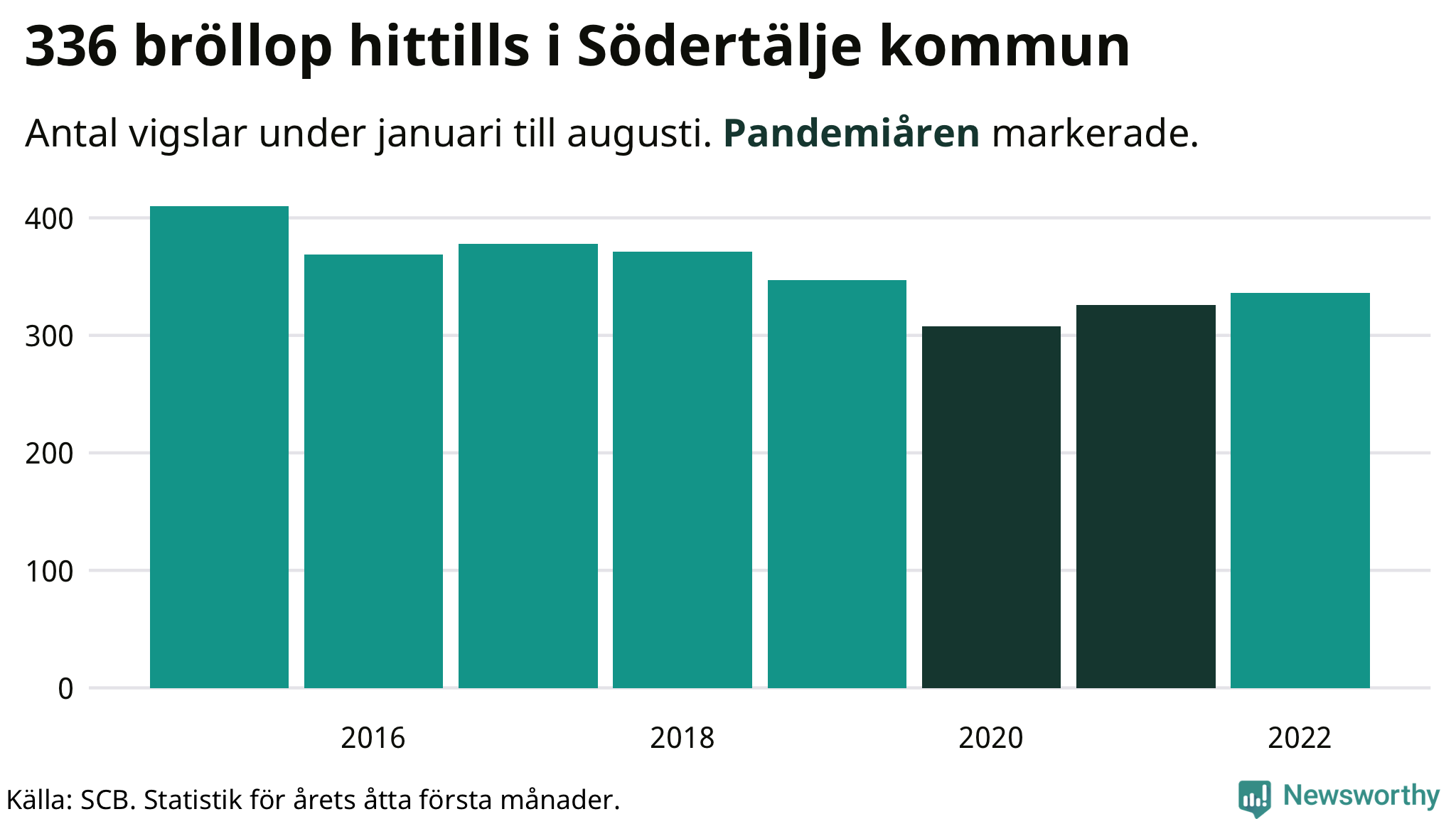 Till och med augusti i år har 336 giftermål registrerats i Södertälje kommun. Det är ungefär på samma nivå som under pandemirestriktionerna, motsvarande siffra för 2020 och 2021 var 308 respektive 326 vigslar.