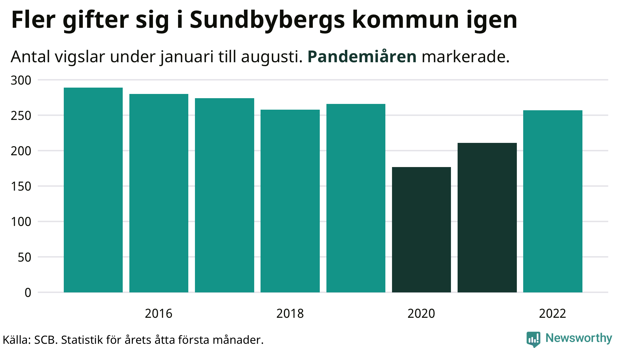 Till och med augusti i år har 257 giftermål registrerats i Sundbybergs kommun. Det är 63 fler än snittet under pandemin. Under 2020 och 2021 – då restriktionerna gällde – sjönk antalet vigslar med en fjärdedel i Sundbyberg jämfört med snittet åren innan.