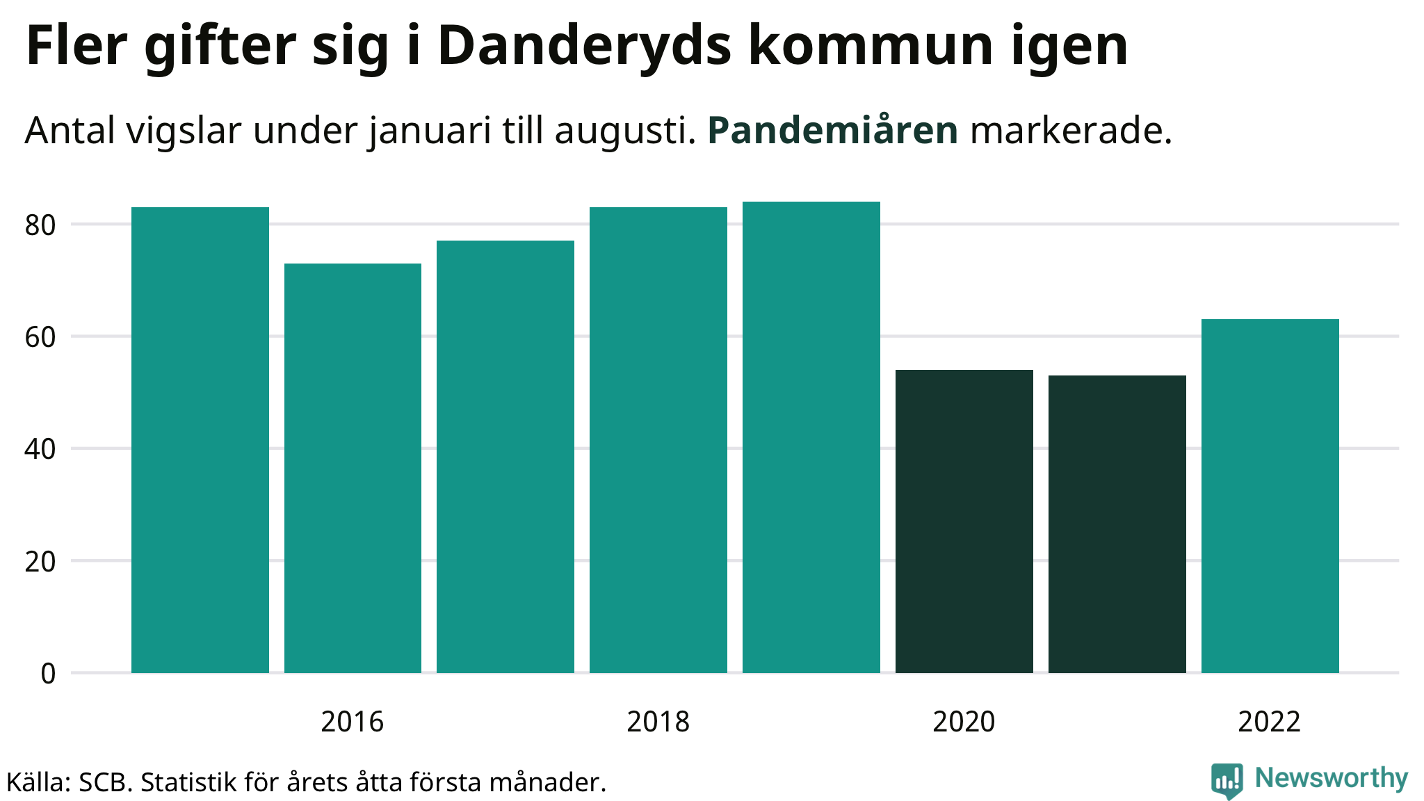 Till och med augusti i år har 63 giftermål registrerats i Danderyds kommun. Det är nio fler än snittet under pandemin. Under 2020 och 2021 – då restriktionerna gällde – sjönk antalet vigslar med en tredjedel i Danderyd jämfört med snittet åren innan.