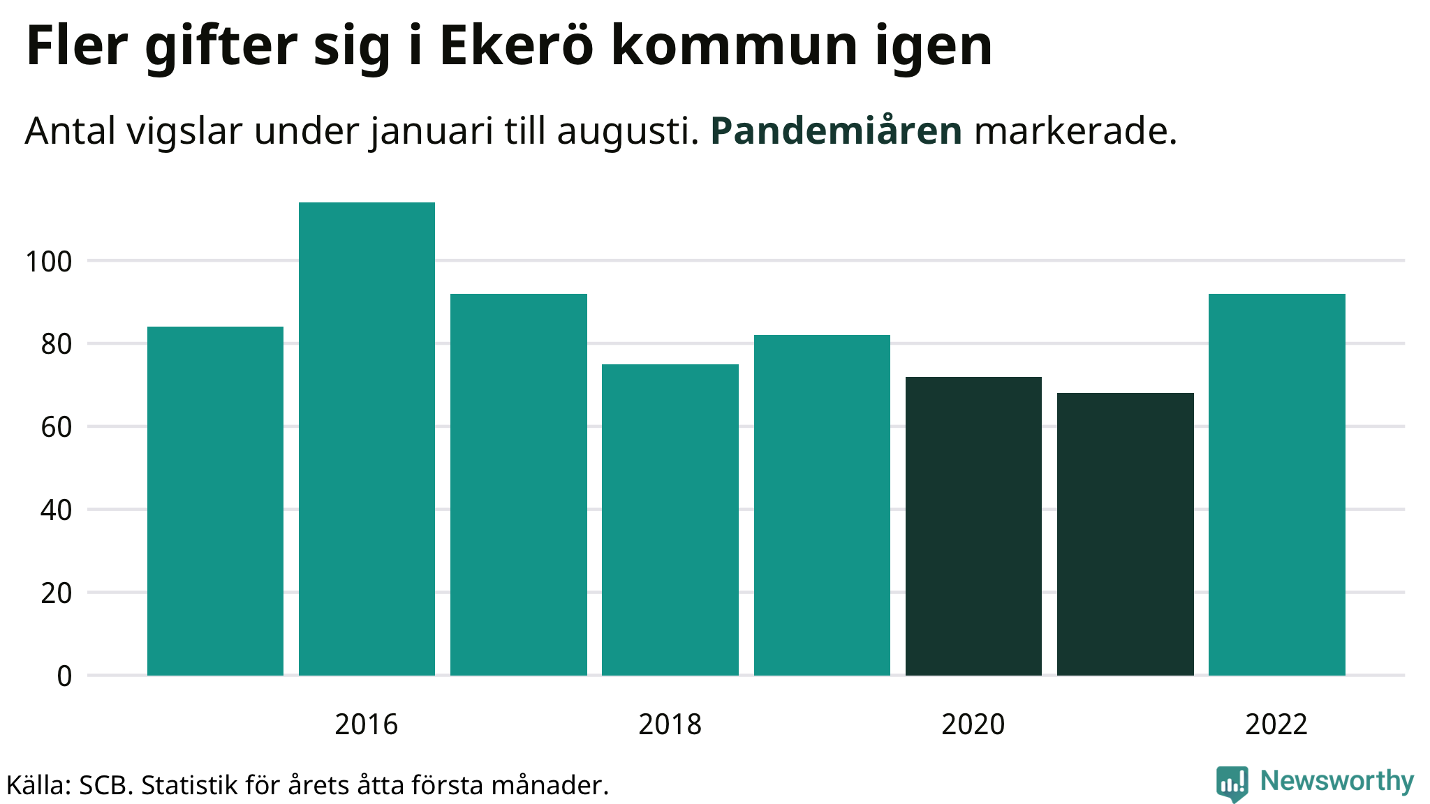 Till och med augusti i år har 92 giftermål registrerats i Ekerö kommun. Det är 22 fler än snittet under pandemin. Under 2020 och 2021 – då restriktionerna gällde – sjönk antalet vigslar med en femtedel i Ekerö jämfört med snittet åren innan.