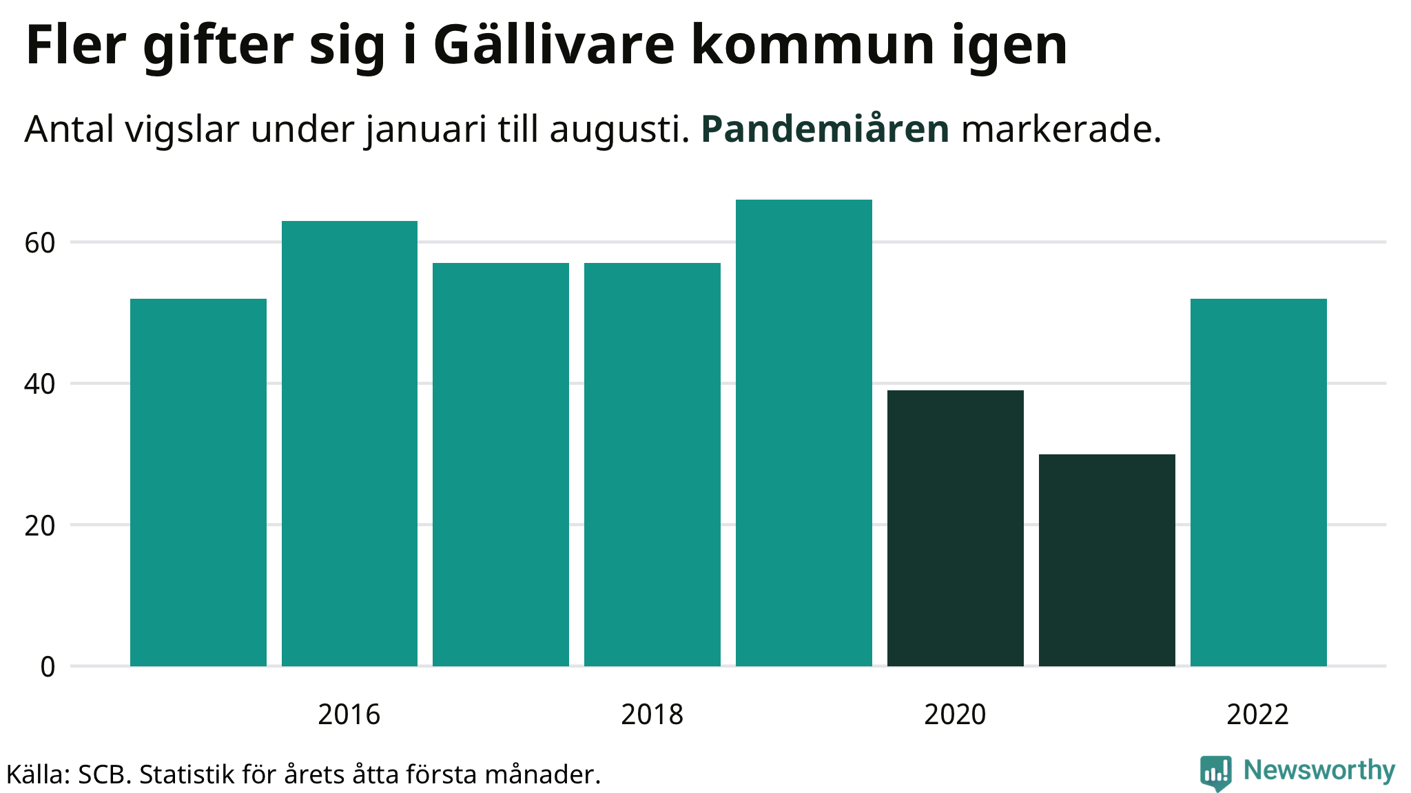 Till och med augusti i år har 52 giftermål registrerats i Gällivare kommun. Det är 18 fler än snittet under pandemin. Under 2020 och 2021 – då restriktionerna gällde – sjönk antalet vigslar med två femtedelar i Gällivare jämfört med snittet åren innan.