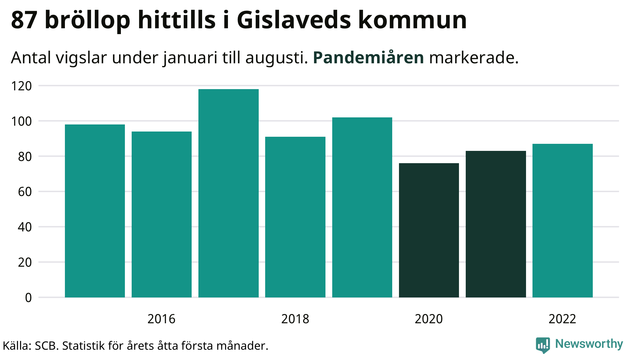 Till och med augusti i år har 87 giftermål registrerats i Gislaveds kommun. Det är ungefär på samma nivå som under pandemirestriktionerna, motsvarande siffra för 2020 och 2021 var 76 respektive 83 vigslar.