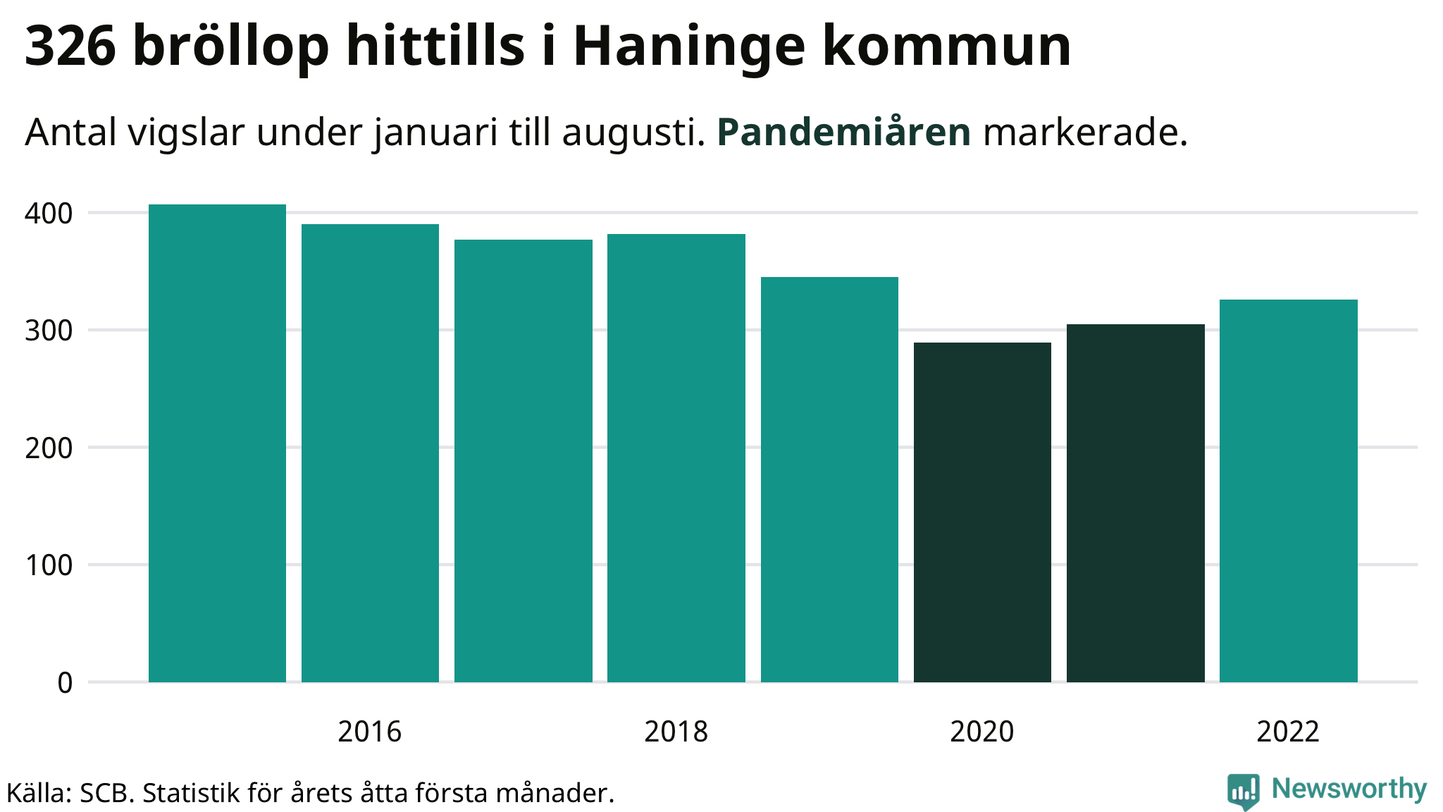 Till och med augusti i år har 326 giftermål registrerats i Haninge kommun. Det är ungefär på samma nivå som under pandemirestriktionerna, motsvarande siffra för 2020 och 2021 var 289 respektive 305 vigslar.