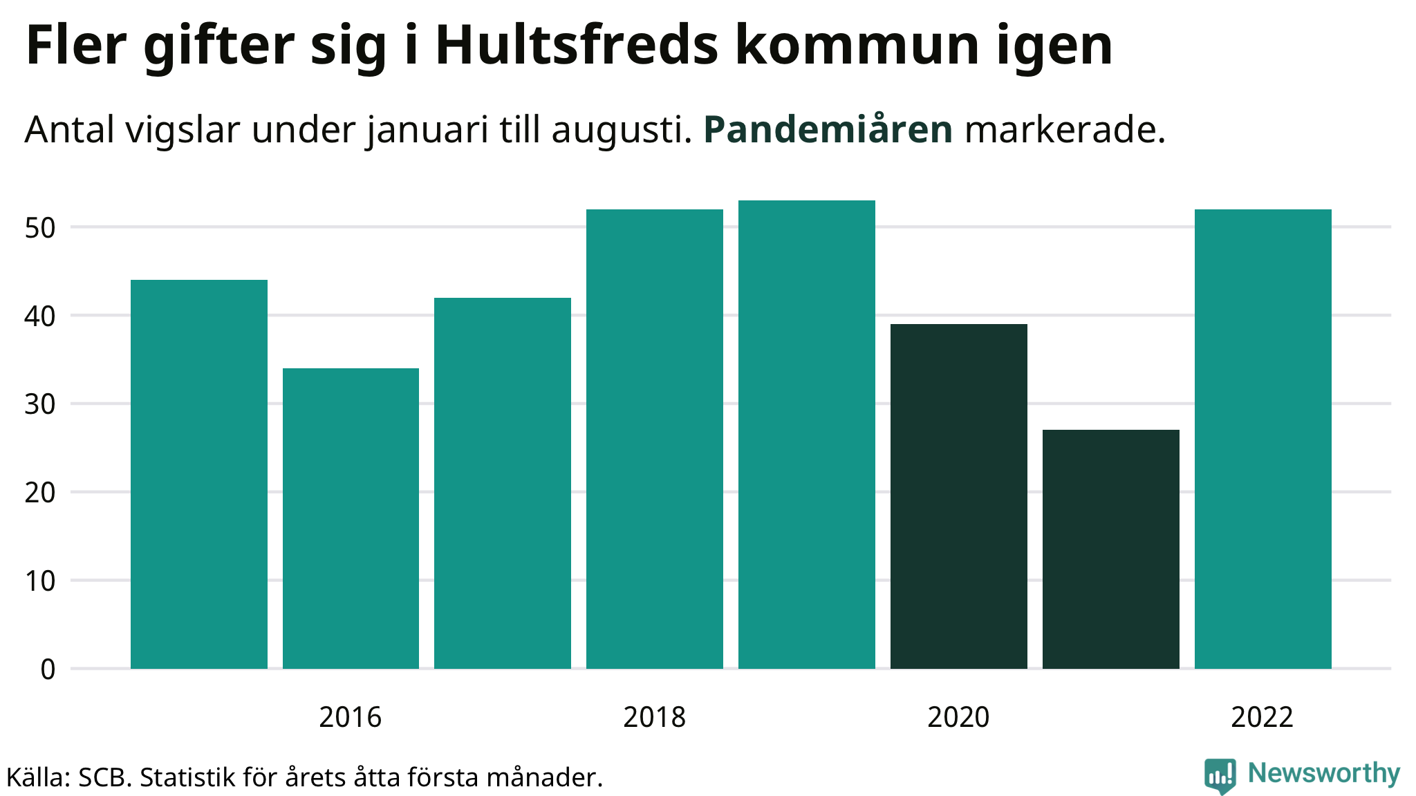 Till och med augusti i år har 52 giftermål registrerats i Hultsfreds kommun. Det är 19 fler än snittet under pandemin. Under 2020 och 2021 – då restriktionerna gällde – sjönk antalet vigslar med en fjärdedel i Hultsfred jämfört med snittet åren innan.