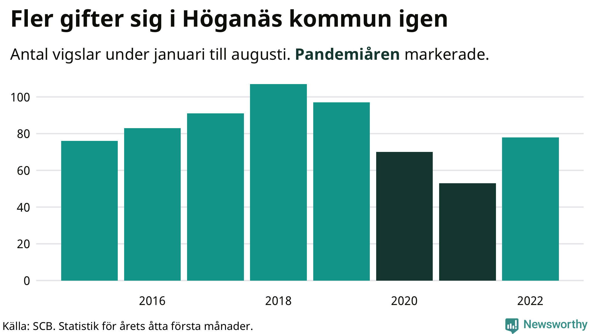 Efter en dipp under pandemin ökar åter antalet giftermål i Höganäs. Under årets första åtta månader har kurvan vänt uppåt, visar SCB:s senaste siffror.