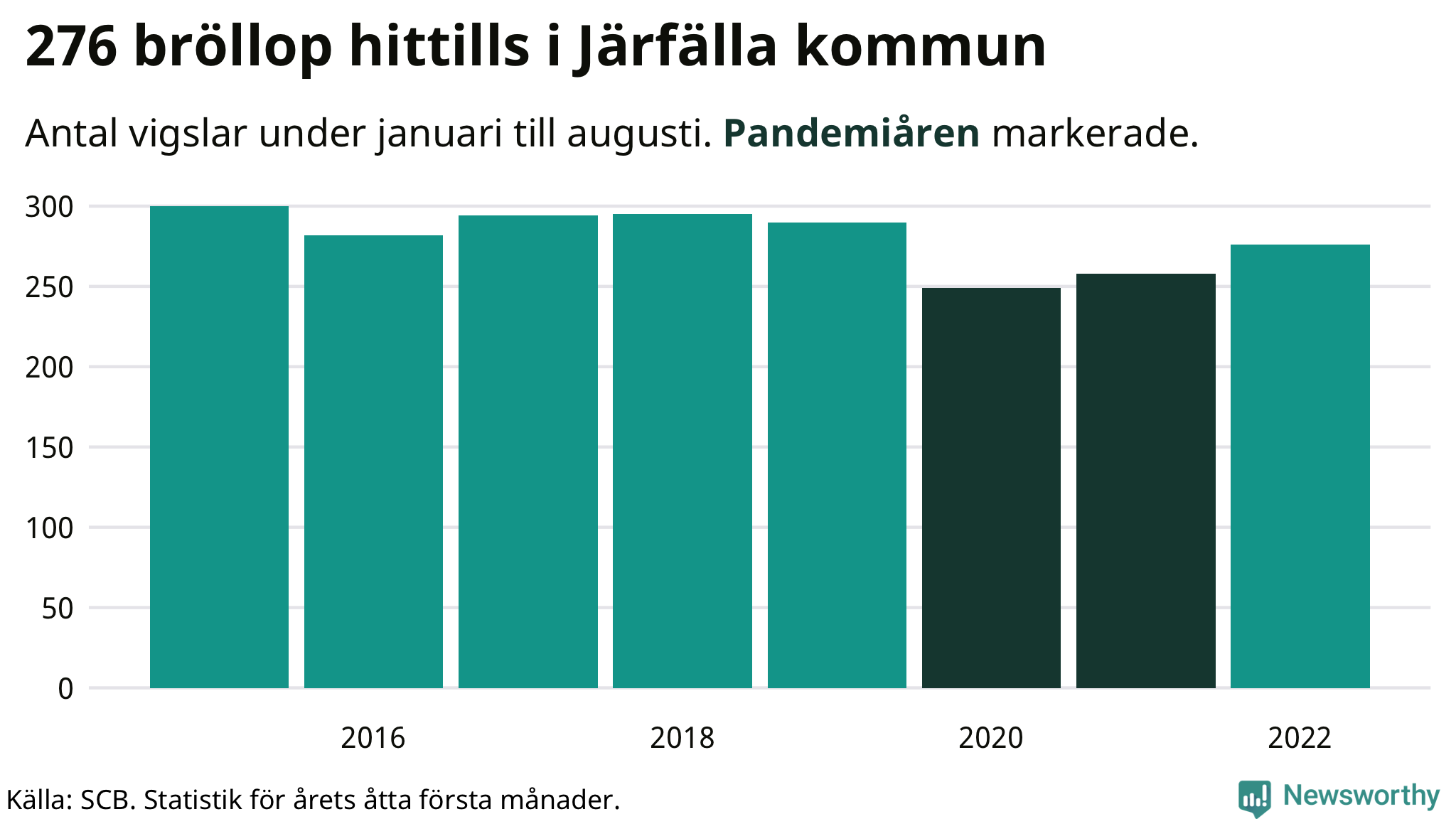 Till och med augusti i år har 276 giftermål registrerats i Järfälla kommun. Det är ungefär på samma nivå som under pandemirestriktionerna, motsvarande siffra för 2020 och 2021 var 249 respektive 258 vigslar.